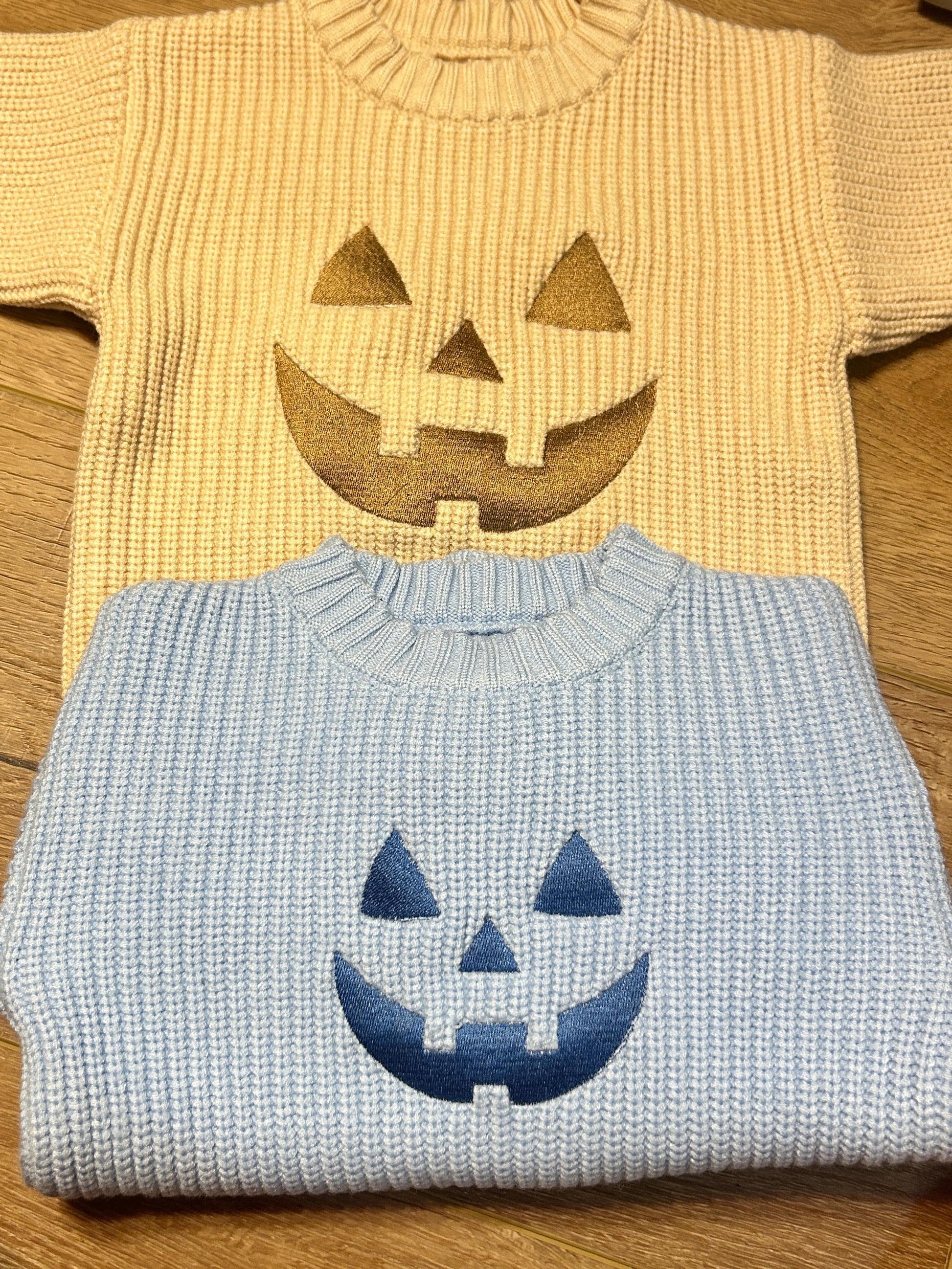 This sweater is absolutely perfect for any fall or spooky season plans you've made with your little ones! Thread color, the face, and the color of the sweater is up to you! Use the drop-downs to choose the face and size, and use the personalization box to put which thread and sweater color you would like.